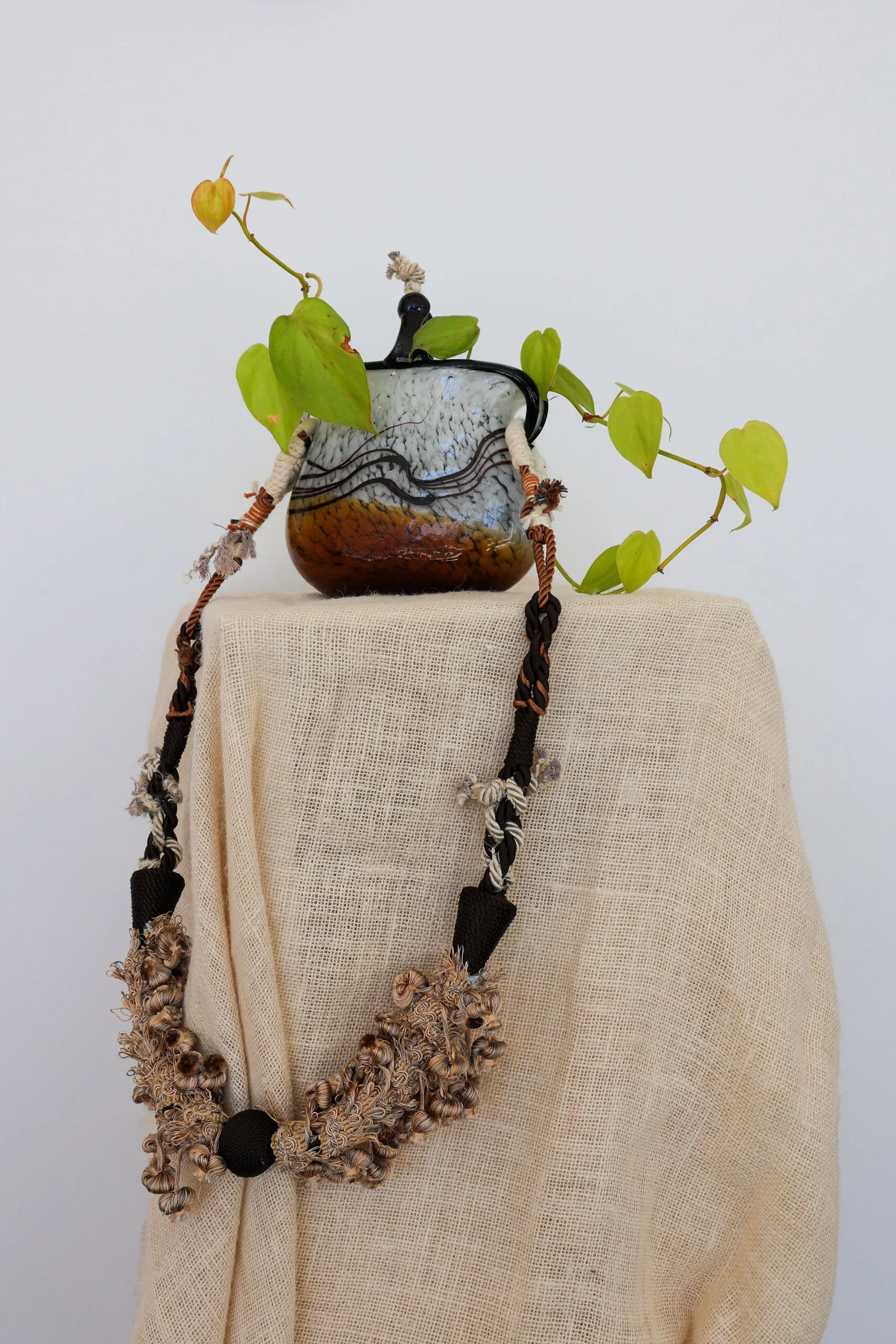 MATERIALS: Salvaged Blown glass piece, secondhand textiles, soil, rocks, Pennies, and heartleaf-, vining philodendron plants